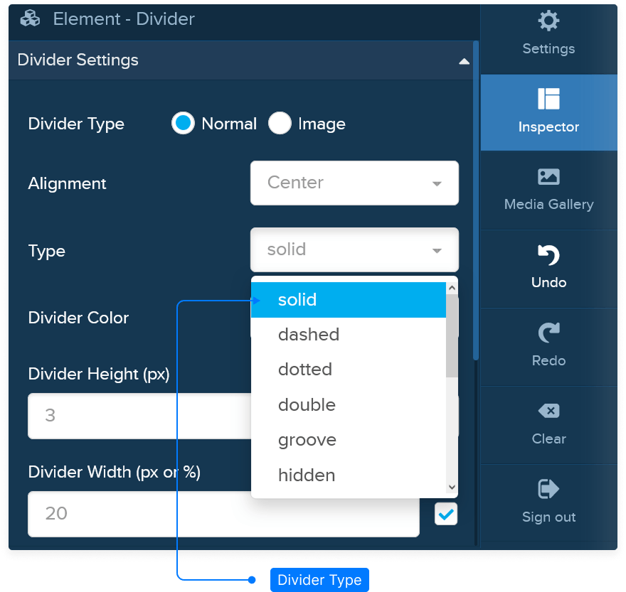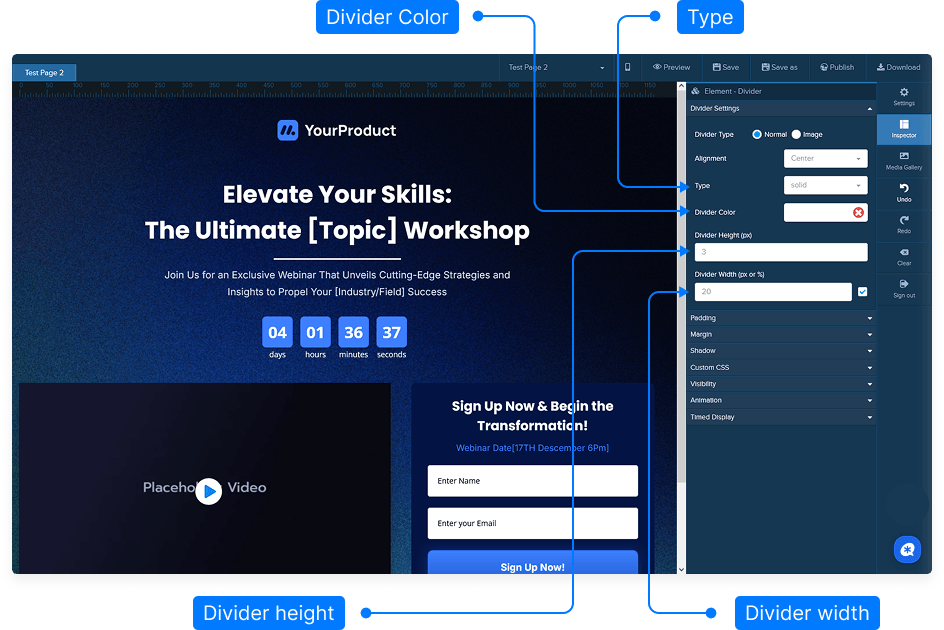 This tutorial will show you how to add and customize a divider element on your page. A divider helps separate content sections visually and can be styled in various ways to fit your design.