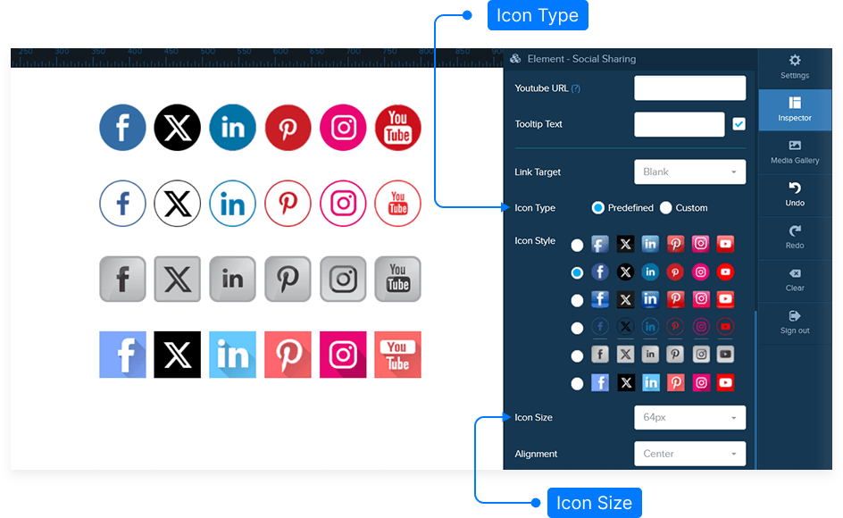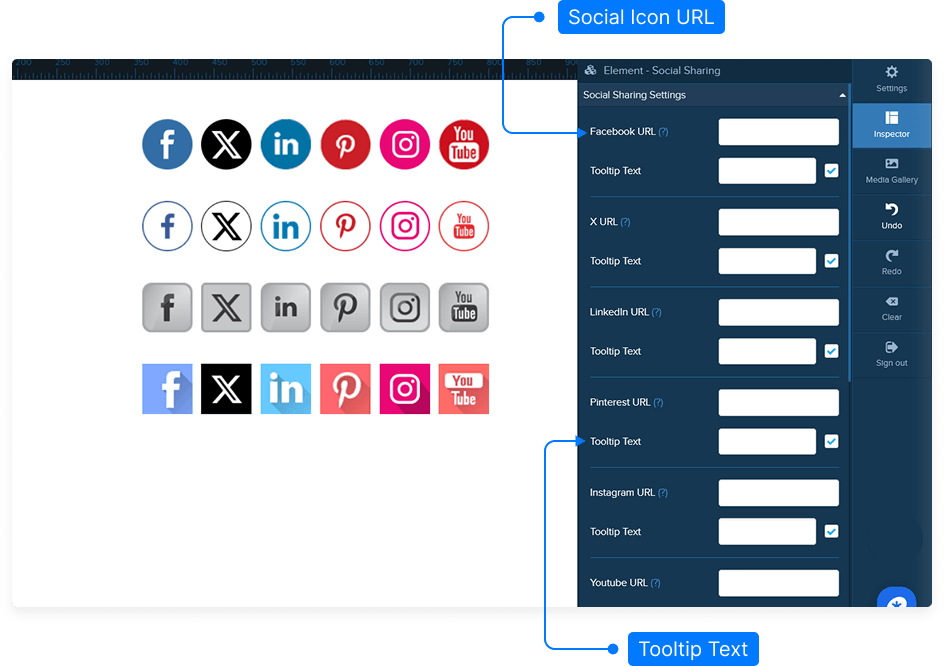 This tutorial explains how to customize or create a social sharing element on your page. You can use preset icons or create your own social sharing section from scratch.